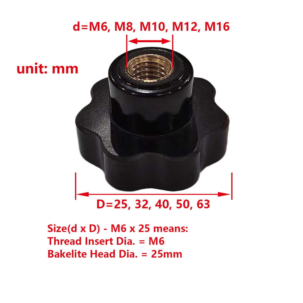 M6x25 (Thread Insert Dia.(d)=6mm, Bakelite Head Dia.(D)=25mm)